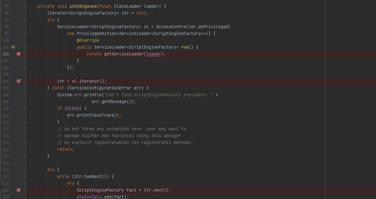 可以看到这是一个很明显的SPI调用过程,我们只需要在远程部署一个实现了ScriptEngineFactory接口的类,并子啊其静态代码块中写入命令执行的代码,并在其Classpath:META-INFO/services/javax.script.ScriptEngineFactory文件中应用该实现类即可完成利用。具体的远程RCE可以上网自行寻找。