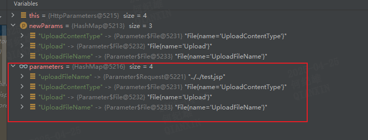 通过观察可知,ActionContext的parameters变量在追加前就已经又一个元素了,这个元素来自我们文件上传时添加的一个input标签其name为uploadFileName,value为../../test.jsp 这个元素与UploadFileName只有首字母大小不一样。 当追加完成后parameters拥有了4个元素,且key为uploadFileName的元素位于第一个 关于FileUploadInterceptor拦截器的代码分析这里就告一段落了,当程序继续运行会运行到另一个拦截器ParametersInterceptor 该拦截器为当前请求对应的Action对象设置属性。 设置属性的方式是通过ActionContext的parameters属性的值将首字母大写后与set拼接作为方法名进行发射调用。 如:属性uploadFileName对应的方法为setUploadFileName,UploadFileName对应的方法为setUploadFileName,这两个属性对应的方法相同, 那么调用的先后顺序是什么,调用是否会出现短路,选择哪一个进行调用都有讲究。